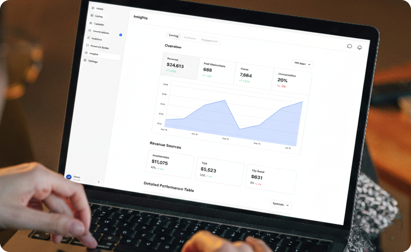 Track your earnings (from process monetization), audience growth, and session performance. See what resonates and optimize your creative strategy.
