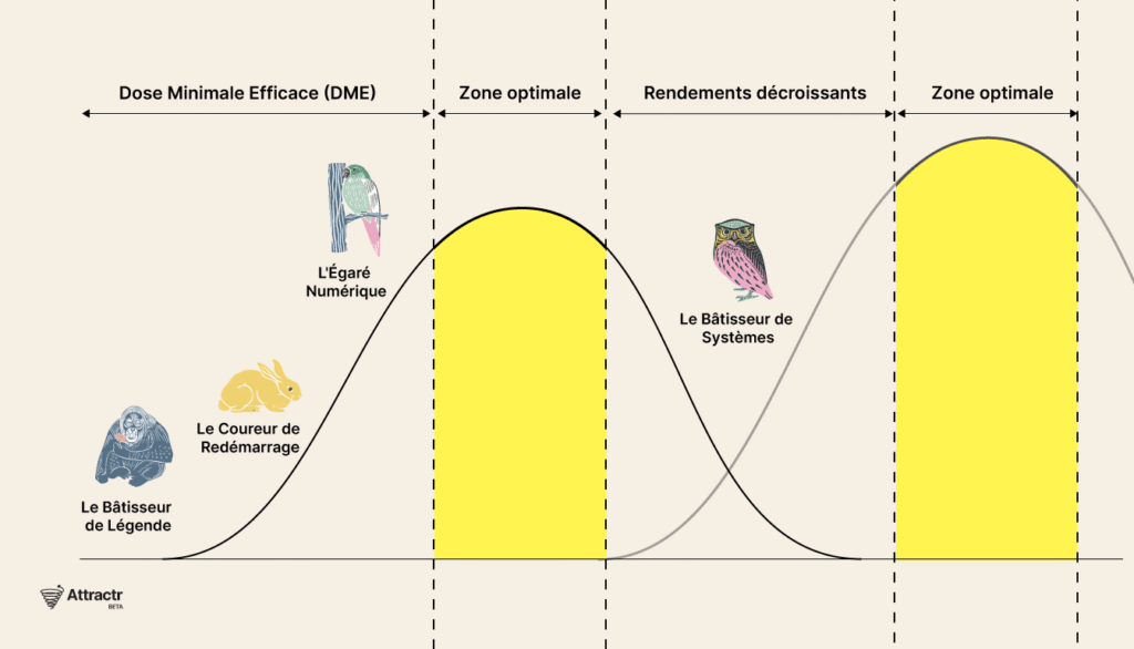 À l’extrême gauche de la courbe se trouve ce qu’on appelle la Dose Minimale Efficace — le minimum d’effort marketing qui donne l’illusion d’être présent, sans vraiment faire avancer les choses.